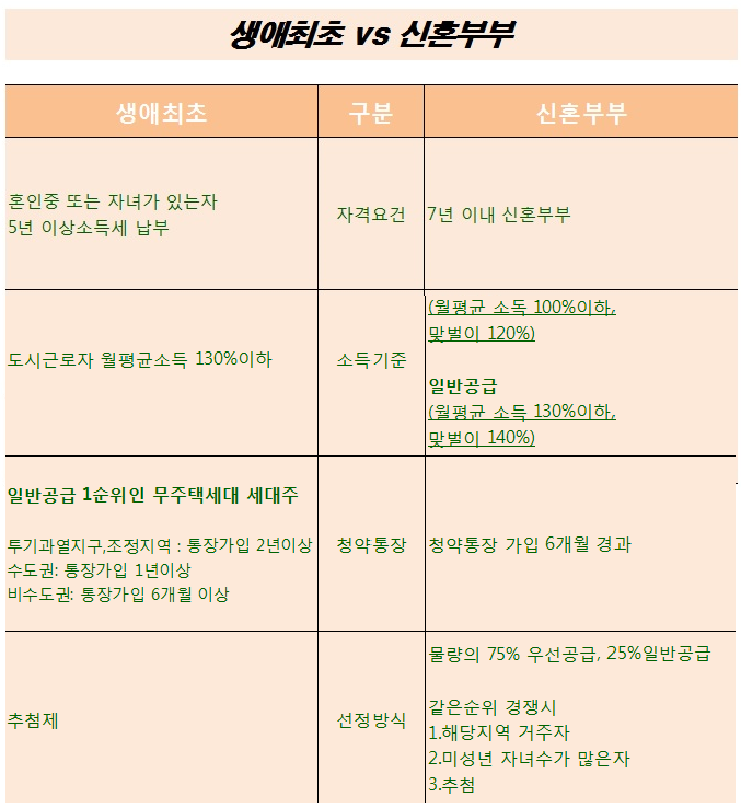 신혼부부 특별공급은 모든 자격 요건을 갖췄다는 전제 아래 자녀가 많을수록 유리합니다. 혼인 기간이 7년 이내이고 자녀수가 2명 이상이며, 청약 지역에 1년 이상 거주한 사람이라면 신혼부부 특별공급에 지원해보는 것이 좋습니다. 반면 자녀가 없거나 신혼이 아니라면 생애최초 특별공급에 지원하는 게 유리합니다. 기본적인 자격 요건만 채운다면 추첨을 통해 선발되기 때문이죠.